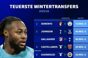 体育资讯1月17日讯 2025-26赛季冬季转会窗已经开启大约半个月时间,德国转会市场盘点了球员的转会费情况,塞梅尼奥7200万欧最高,布伦南·约翰逊和加拉格尔均4000万欧并列次席。
