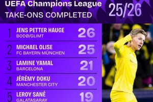 体育资讯1月23日讯 数据机构Squawka统计本赛季欧冠球员成功过人次数榜,海于格26次居首,奥利塞25次第二,亚马尔21次第三。