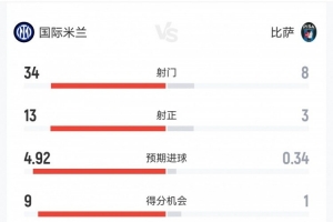 体育资讯1月24日讯 本轮意甲,国米让二追六逆转比萨。双方全场重点数据对比如下↓(主队国米在前)