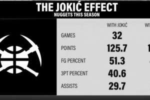 无约基奇 16场场均108.8分24.3助 命中率45.6% 三分命中率37.5%