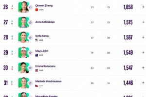 WTA排名更新,萨巴伦卡、斯瓦泰克仍居前2,莱巴金娜上升2位至第3,高芙下跌2位至第5,郑钦文再跌1位至第26,王欣瑜上升13位至第33。