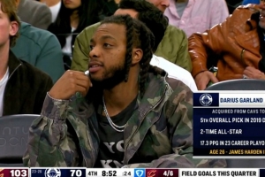 快船主场迎战骑士,新援加兰来到板凳席观战。