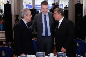 体育资讯2月11日讯 《阿斯报》撰文认为,欧足联主席切费林、皇马主席弗洛伦蒂诺与欧洲足球俱乐部协会主席纳赛尔正式达成一项历史性原则协议,标志着持续六年的欧超计划彻底终结。值得注意的是,巴萨并未参与相关会议。