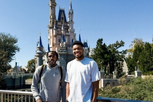 雄鹿官方社媒配文写道:“两个游玩迪士尼的大孩子。”