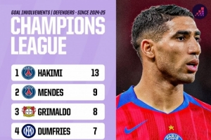 体育资讯2月18日讯 Opta统计了近两个赛季后卫在欧冠比赛中参与进球的数量,并列出榜单,阿什拉夫参与13球居首。