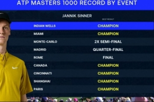 体育资讯3月16日讯 在夺得ATP1000印第安维尔斯大师赛冠军后,辛纳已经在9站大师赛夺得了6站冠军,还差3站红土大师赛。