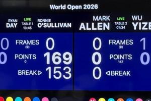 第一局奥沙利文单杆打出罕见的153分。 由于瑞恩·戴违规,奥沙利文这局打了16套红球加彩球,14套红球与黑球,2套红球与粉球。