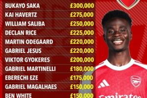 体育资讯01月11日讯 多方报道称阿森纳与萨卡敲定新合约,他将在阿森纳拿到30万镑的队内顶薪,《太阳报》罗列了阿森纳队内的最新周薪排名。
