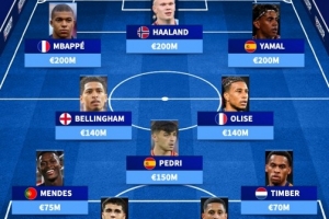 前锋:姆巴佩(法国、皇马、2亿欧)、哈兰德(挪威、曼城、2亿欧)、亚马尔(西班牙、巴萨、2亿欧)